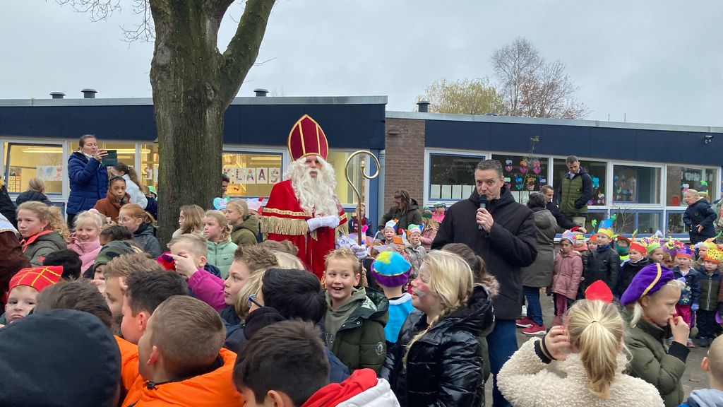 HOEVELAKEN - Terwijl alle kinderen en docenten buiten op de Sint stonden te wachten, de koude maandagochtend van 5 december, ontving directeur Vincent DeJonghe een telefoontje dat de Sint vast stond op het knooppunt. En dat terwijl Sinterklaas het al zo verschrikkelijk druk heeft! Er zat dan even niets anders op, om de tijd te doden door te zingen en te springen. Ook om warm te blijven. Gelukkig werd de Sint en zijn Pieten gered door de politie. Met de staf uit het raam van de politieauto, kwam met veel lawaai de Sint in hoog tempo dan aan op Kindcentrum De Spreng.