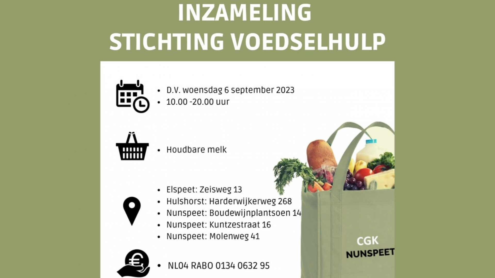 "Deze maand vragen we om houdbare melk maar tijdens bijvoorbeeld een dankdag kan het ook zijn dat we om een iets luxer product vragen zoals bijvoorbeeld kaas. Iedere maand vragen we om andere producten," vertelt John. Er is een groepsapp aangemaakt waar elke maand, net vóór de inzameling, 1 appje geplaatst wordt wat er die maand ingezameld wordt. Wil jij ook toegevoegd worden aan deze app stuur een berichtje naar 06-29390875. Ben je niet in de gelegenheid om een product langst te brengen maar wilt u toch iets doen, dan kunt u ook een gift overmaken: NL04RABO0134063295 t.n.v. Voedselhulp Nunspeet.